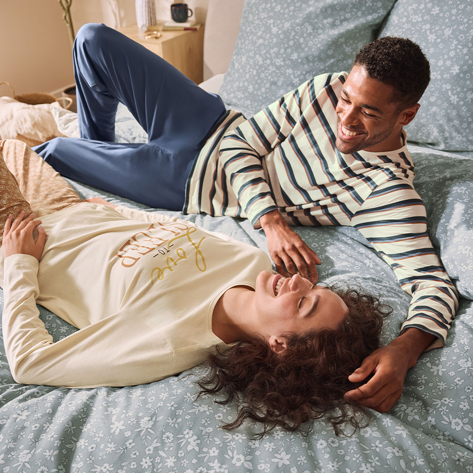 Strakke pasvormen of krappe sluitingen? Absoluut niet! Bij pyjama’s draait alles om comfort en bewegingsvrijheid. Daarom zijn elastische taillebanden, flexibele boorden en zachte striklinten de standaard. De fits zijn relaxed, de snits comfortabel en je kunt naar hartenlust mixen en matchen met je favoriete loungewear.